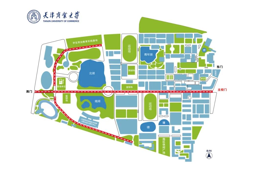 道路贯穿主校门至西门,在西门南北方向延伸,途经图书馆、南北湖、国际教育交流中心、冷链物流设施技术创新与职业能力提升中心、体育馆、学生劳动教育实践基地(天商农场)等区域。